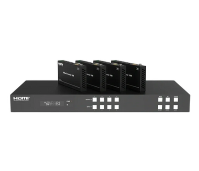 IMOWARE HDB440K-4K-150 is a controllable Matrix and can switch 4 HDMI sources to 8 displays. The resolution is up to 4K2K@60Hz 4:4:4, 18Gbps, Pixel Clock 600MHz and HDCP 2.2. Each HDMI output supports 4K2K to 1080P downscale independently. The IR signal follows HDMI video channel at the HDBaseT Receiver end. The product provides an intuitive set of front panels with OLED screen and supports control via front panel buttons, IR remote, RS-232, LAN, and Web GUI.